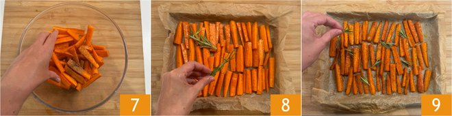 Massage the sticks to coat them evenly. Place the carrots on a baking sheet lined with parchment paper, making sure not to overlap them, add some sprigs of rosemary 8, and bake in a preheated static oven at 430°F for 40 minutes. Once cooked, garnish with more fresh rosemary. Your baked carrots are ready to be served 9!