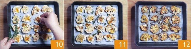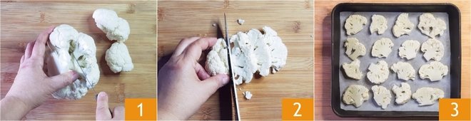 To prepare the baked cauliflower, first clean the cauliflower by removing the outer leaves and the stem, then separate the florets 1 and rinse them. Cut the florets into slices about 0.4 inches thick 2 and place them on a baking sheet lined with parchment paper 3.