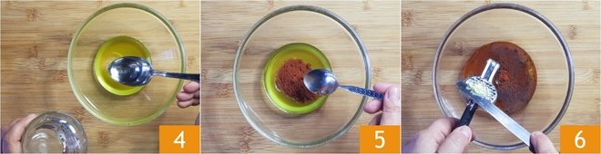 Pour the oil and water into a small bowl 4, then add the paprika 5 and the crushed or finely chopped garlic 6.