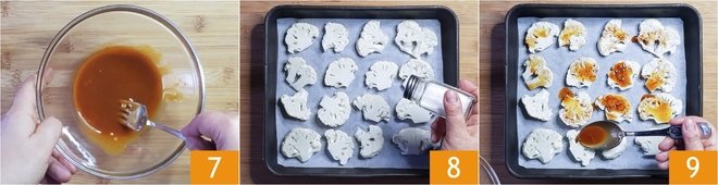 Mix well with a fork 7. Lightly salt the cauliflower slices 8 and dress them with the emulsion 9.