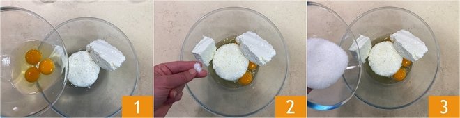 To prepare the baked cheesecake with tvorog, first, melt the butter and let it cool slightly. Pour the tvorog cheese, eggs 1, salt 2, and sugar 3 into a large bowl.