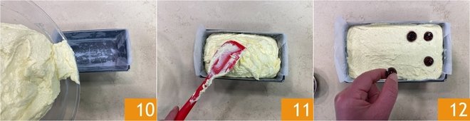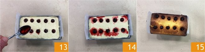 Pour the mixture into a loaf pan measuring 10x4.3x2.8 inches lined with parchment paper 10 and level the surface 11. Insert the syrup-soaked cherries in two evenly spaced rows, pressing slightly 12.