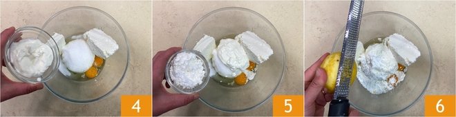 Add the sour cream 4 and cornstarch 5, then grate the lemon zest 6.