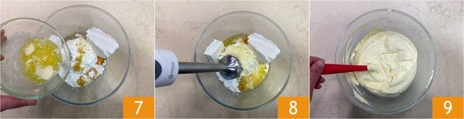 Finally, add the melted and slightly cooled butter 7 and blend with the immersion blender 8 until you get a homogeneous mixture 9.