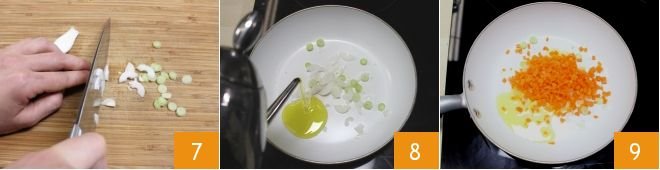 Then take a fresh spring onion, remove the stem and base, and chop it 7. Heat the oil in a large non-stick skillet and let the spring onion soften over low heat 8. Then add the finely chopped carrots 9.