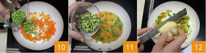 Add the shelled peas 10 and cook over low heat for about 20 minutes. In the last 5 minutes of cooking, add the diced zucchini 11, salt, and pepper, and finish cooking. Once cooking is complete, add the freshly grated ginger 12.