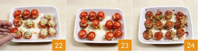 Take the tops of the cherry tomatoes that you set aside and place them on top of the stuffed tomatoes, closing them 22. Once closed, bake in a preheated static oven at 356°F (180°C) for 20 minutes, if using a convection oven, bake at 320°F (160°C) for 10 minutes 23. When they are golden and slightly roasted 24, remove from the oven, let them cool slightly, and serve!