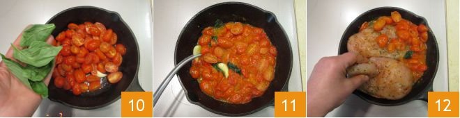 Flavor with basil leaves 10 and cook on low heat for 10 minutes. After this time, remove the garlic cloves 11 and add the chicken breast 12.