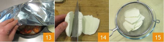 Cover with aluminum foil 13 and transfer to a preheated oven for 25 minutes at 392°F. Meanwhile, slice the mozzarella 14 and let it drain in a colander 15 to lose its whey.