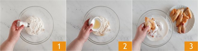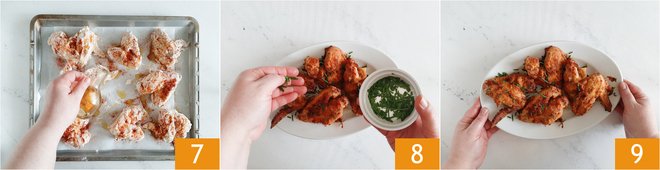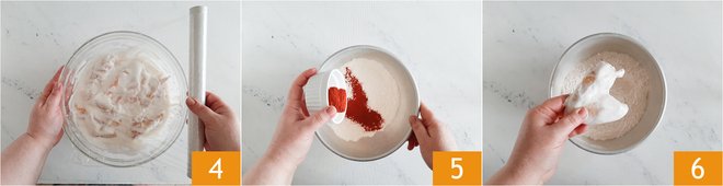 Cover with plastic wrap 4 and let marinate for 3 hours in the refrigerator. After the marinating time, drain the wings coarsely, so as not to completely remove the yogurt. In a bowl, pour the flour and paprika 5, coat the wings 6.