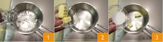 To prepare the baked cocoa zeppole, start with the choux pastry. In a saucepan, pour the water 1, the butter cut into pieces 2, the sugar 3,