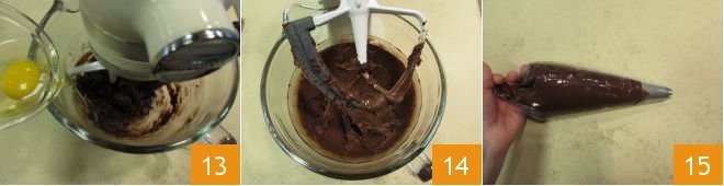 and when it is completely absorbed, continue adding the eggs slowly 13. Work until you obtain a smooth and lump-free dough 14, then transfer it into a piping bag fitted with a 0.5 inch star tip 15.