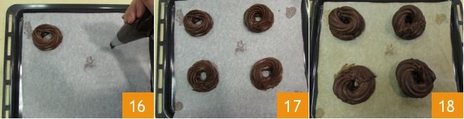 Line a baking sheet with a sheet of parchment paper; to secure it, you can place two or three small blobs of dough between the parchment paper and the tray. Then create the zeppole, for each you will need to make two rounds, one on top of the other, to create a circle about 4 inches in diameter (16-17). Bake in a preheated static oven at 392°F for about 30 minutes, then switch to fan mode and bake for another 15 minutes. After this time, turn off the oven and leave the zeppole inside for 10-15 minutes. Remember that every oven is different, so you can slightly reduce the necessary time. At this point, remove the cocoa zeppole from the oven 18