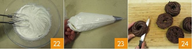 until the cream is whipped 22. Transfer it into a piping bag with a star nozzle 23. At this point, take the zeppole and cut them in half 24.