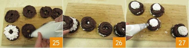 Fill the bottom part of the zeppole with cream 25, cover with the top part 26 and finish by placing a generous dollop of cream in the center 27.