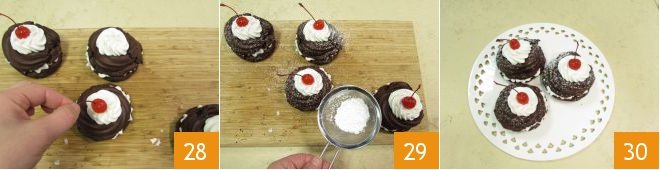 Garnish with a maraschino cherry 28, dust with powdered sugar 29 and serve your baked cocoa zeppole 30.