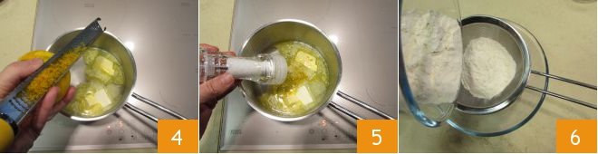 the orange zest 4 and a pinch of salt 5. Heat everything over low heat until it just comes to a boil. Meanwhile, in a bowl, sift the all-purpose flour 6