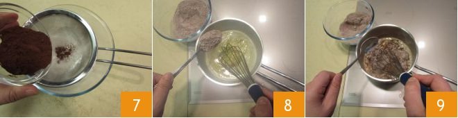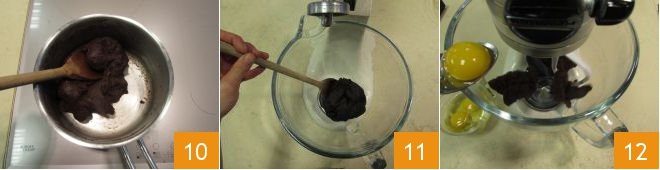 and the cocoa 7 and mix the powders. As soon as the water and butter mixture comes to a simmer, start adding the powders little by little, mixing with a whisk (8-9).