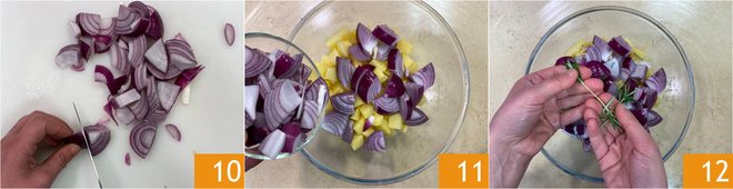 Cut the onions into wedges 10. Gather the potatoes and onions in a bowl 11 and season with rosemary 12.