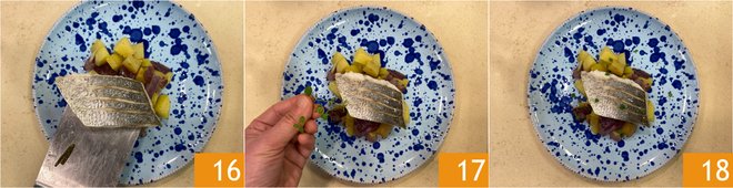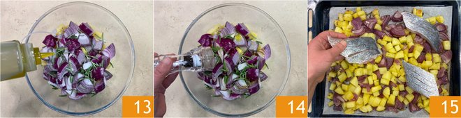 Add oil 13, salt, and pepper 14. Mix so that the seasoning coats all the vegetables well. Then place them on a baking sheet lined with parchment paper and bake in a preheated static oven at 400°F for 35 minutes. Remove the baking sheet from the oven and lay the croaker fillets on the vegetables 15. Return to the oven and bake for another 10 minutes under the same conditions. The fish should be golden, cooked but not dry.