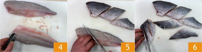 Remove any bones with tweezers 4. Cut the fillets into lozenges of about 6 oz each 5 and make 2-3 cuts on the skin 6.
