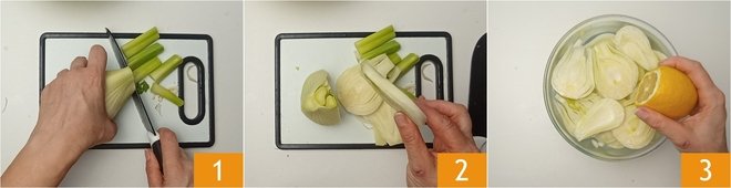 To prepare baked fennel, first clean the fennel by removing the ends 1; you will get about 800 grams (1.76 lbs). Then cut them into slices 3/8 inch thick 2. As you work, place them in a bowl with cold water and lemon juice 3.
