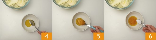 In the meantime, prepare the emulsion: in a small bowl, pour the oil 4, the honey 5, and a level teaspoon of salt 6.