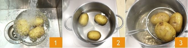 To make the baked gnocchi skewers, start by preparing the white gnocchi (for more details, see the Potato gnocchi recipe). Wash the potatoes 2 and, without peeling them, place them in a pot with salted water and let them boil for about 25-30 minutes 2 until they become soft, then drain them 3.