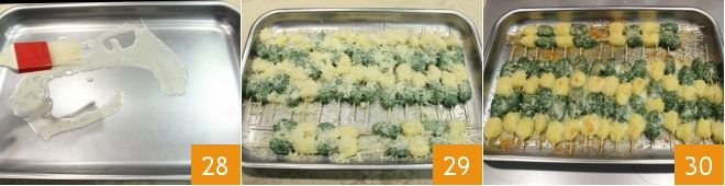 Cook the green gnocchi in the same way, then drain them 25, place them in a bowl and dress with a little oil 26. At this point, you can assemble the skewers: take a wooden skewer and alternate the white and green gnocchi 27.