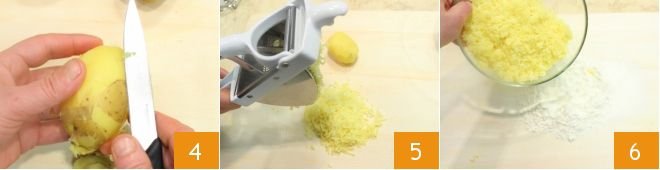While still hot, peel them 4, mash them with a potato masher 5 and place them on a work surface with the flour 6