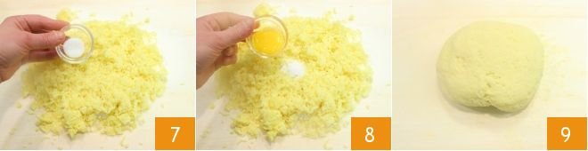 make a small well and add the salt 7, the egg yolk 8 in the center and knead everything until you get a compact dough. Knead until you obtain a compact, smooth dough without lumps 9.