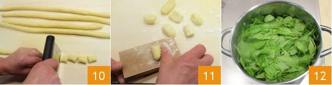 Divide the dough into logs about 1 inch thick and start cutting your gnocchi 10. Finally, create the characteristic ridges of the gnocchi by rolling each piece on a gnocchi board or fork 11. Now, take care of the green gnocchi (for all details, see the recipe: Green gnocchetti) wash the spinach and cook them in a little salted water 12. In another pot, cook the potatoes by boiling them with the skin, as you did previously with the classic gnocchi.