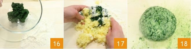 On a board, place the flour, spinach 16, peeled and mashed potatoes, and knead everything 17 until you obtain a compact dough 18.