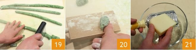Continue as you did before: divide the dough into logs about 1 inch thick and start cutting your gnocchi with a pasta cutter 19. Finally, create the typical ridges 20. As you make them, place the finished gnocchi on a tray covered with a floured cloth. Separately, grate the Montasio 21 and Grana.