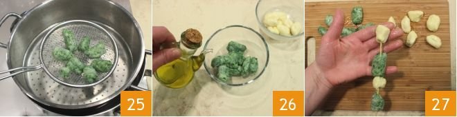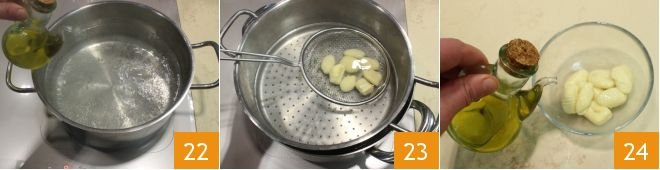 Cook all the white gnocchi in salted water with a drop of olive oil 22, drain them when they float to the surface, it will take a couple of minutes, then drain them 23, place them in a bowl and dress with a drizzle of olive oil 24.