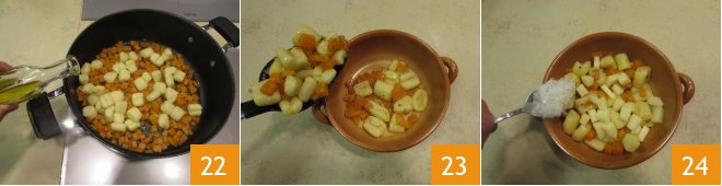 When the pumpkin is ready 19, cook the gnocchi in batches in plenty of boiling salted water as desired 20. As they are ready, drain them with a slotted spoon and transfer them into the pan with the pumpkin 21.