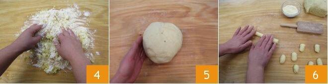 and knead everything with your hands 4 until you obtain a soft but compact dough 5. Remember that overworking them will make the gnocchi hard during cooking, so only knead as necessary. Take a portion of the dough and roll it with your fingertips to form strands about 0.75 inches thick 6; use some semolina to lightly flour the work surface as needed. Meanwhile, cover the remaining dough with a cloth to prevent it from drying.