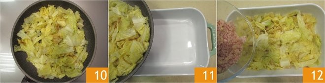 When the cabbage has wilted 10, pour almost all of it into a 8x12 inch baking dish, making sure to cover the bottom 11. Cover with the ham and cheese mixture 12.
