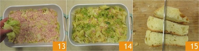 Add the remaining cabbage 13 and cook in a preheated static oven at 400°F for 15 minutes 14. Meanwhile, cut the bread into chunks 15.