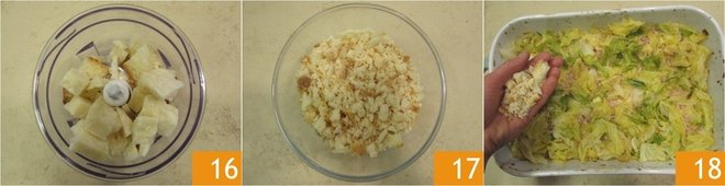 Transfer the bread to a mixer along with the diced Parmigiano Reggiano PDO 16 and blend coarsely 17. Once the cooking time is up, take the baking dish out and distribute the bread and Parmigiano Reggiano PDO mix on the surface 18.