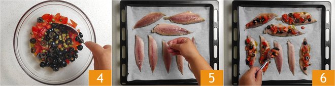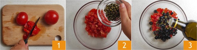 To prepare the baked mackerel, first wash and dry the tomatoes, then cut them into very small cubes 1. Transfer them to a bowl and add the capers 2, sliced black olives, and extra virgin olive oil 3.