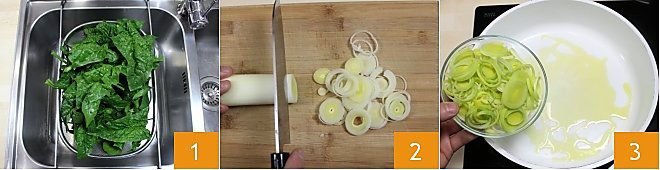 To prepare the baked omelette with ricotta and spinach, start by thoroughly washing the spinach 1, then remove the larger stems and drain them. Thinly slice the leek 2, after removing the outer leaves and discarding the greener part of the stem; heat three tablespoons of oil in a non-stick pan and sauté the leek 3;