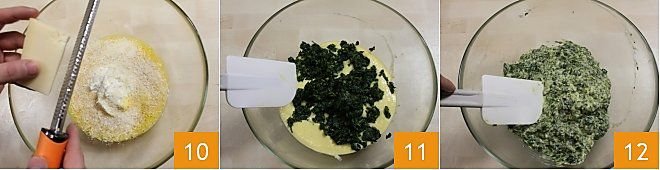 then add the grated Parmesan and grated Emmental 10 and beat again. At this point, add the spinach to the egg and cheese mixture 11, mix everything well 12.