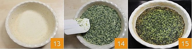 Meanwhile, butter and sprinkle with breadcrumbs a round mold about 9 inches in diameter 13. Pour the mixture into the pan, level it with a spatula 14 and bake in a preheated static oven at 355°F and cook for at least 30-40 minutes (or in a convection oven at 320°F for about 25 minutes); the omelette will be ready when it starts to come away from the edges of the mold and the inside is no longer creamy 15. You can serve the baked omelette with ricotta and spinach hot or warm.