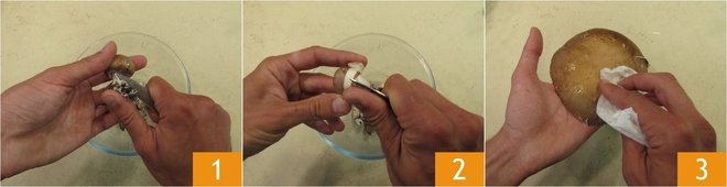 To prepare baked pasta with mushrooms and sausage, first clean the button mushrooms: cut the base of the stem 1 and peel the top of the mushroom 2. For the portobello mushrooms, just clean them with a damp cloth to remove the dirt 3.