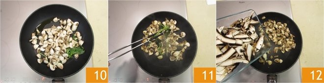 Heat the pan very well and add the button mushrooms 10, let them brown over very high heat for a few minutes, remove the basil 11, and add the rest of the mushrooms 12.