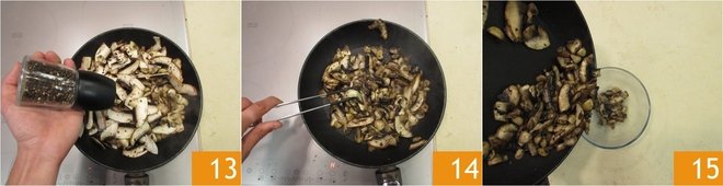 Let them brown for about 5 minutes, always over high heat, season with salt and pepper 13. When the mushrooms are cooked, remove the garlic 14 and set them aside 15.