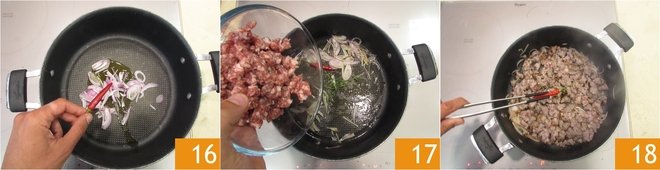In another large pan, pour a drizzle of oil, add the shallot and the chili pepper. Let it brown for a few minutes, then raise the heat and add the sausage 17. Let it brown over high heat for about 6-7 minutes, then remove the chili pepper 18.