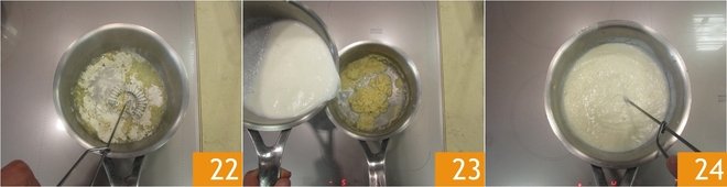 Adjust with salt and pepper 19 and set aside. Place a pot filled with water on the stove, salted to your taste, which will be used for cooking the pasta. Now take care of the bechamel, heat the milk in a saucepan adding a pinch of salt and pepper 20. In another saucepan, heat the butter and as soon as it sizzles, add the flour all at once 21.