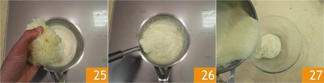Turn off the heat, add 5.3 oz of grated Casera cheese 25 and mix with a spatula 26. Transfer the bechamel to a bowl 27.